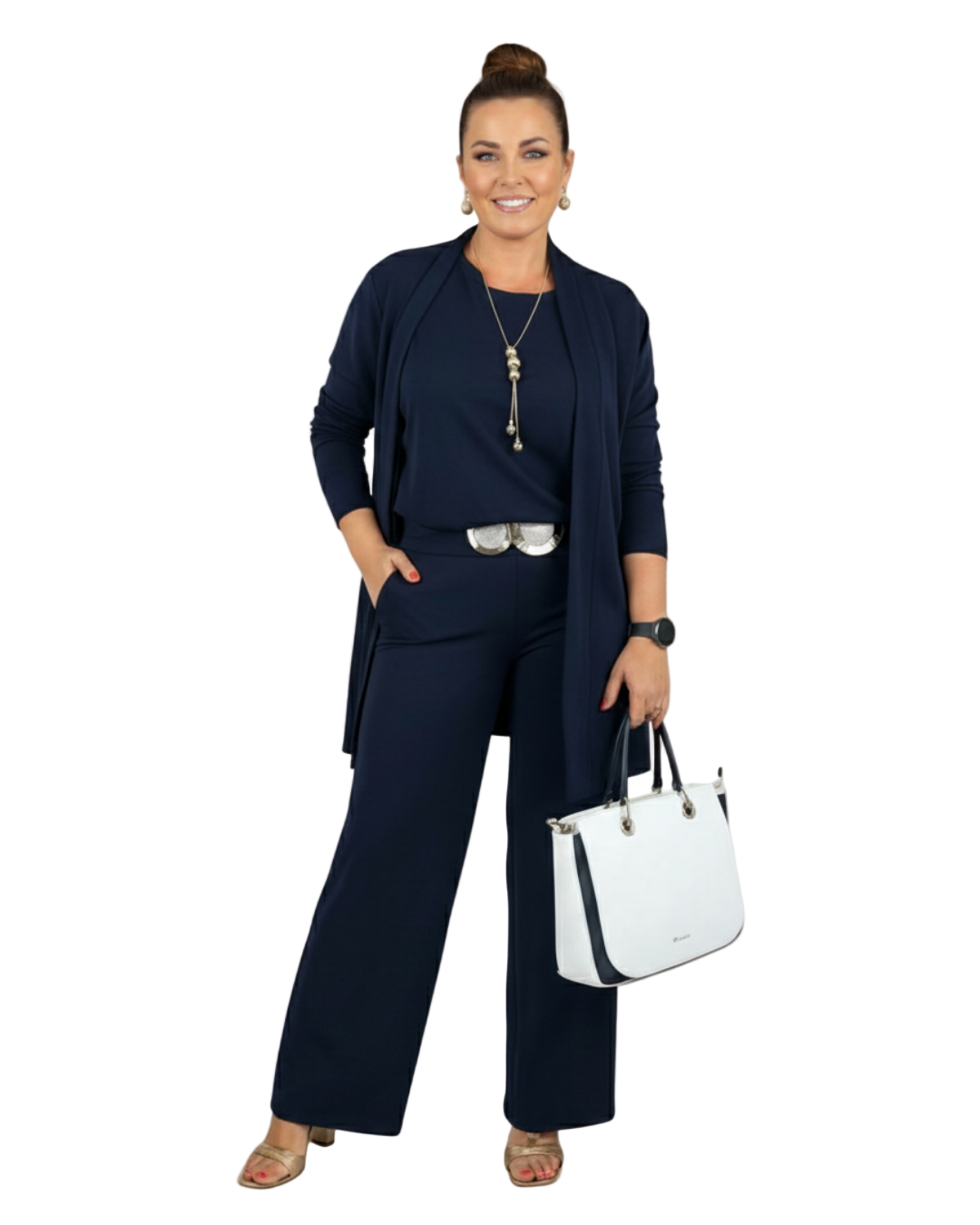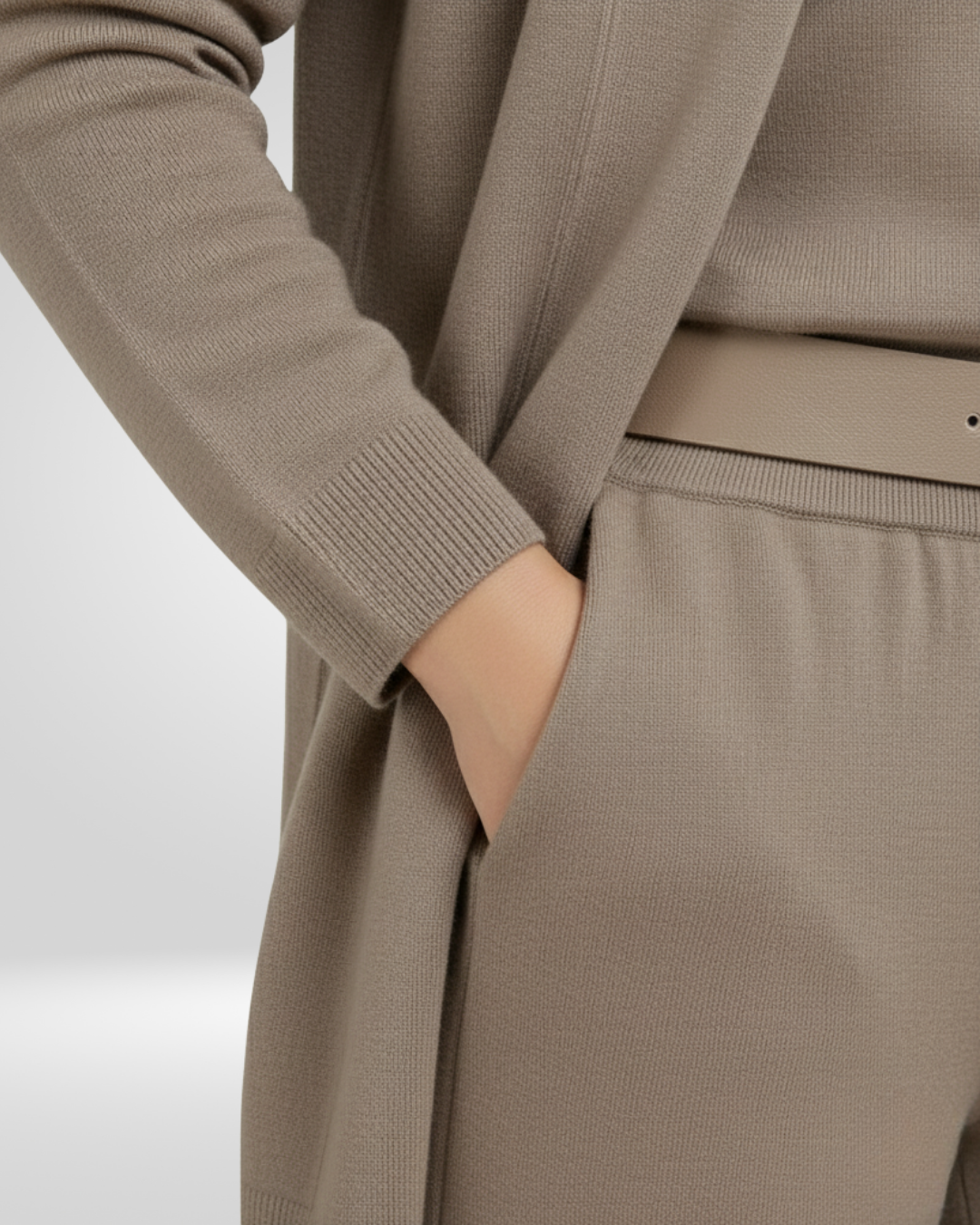 The AMÉLIE 3-piece set combines comfort and sophistication with understated simplicity. The long cardigan, top, and pants create an elegant outfit that can be worn both casually and chic.