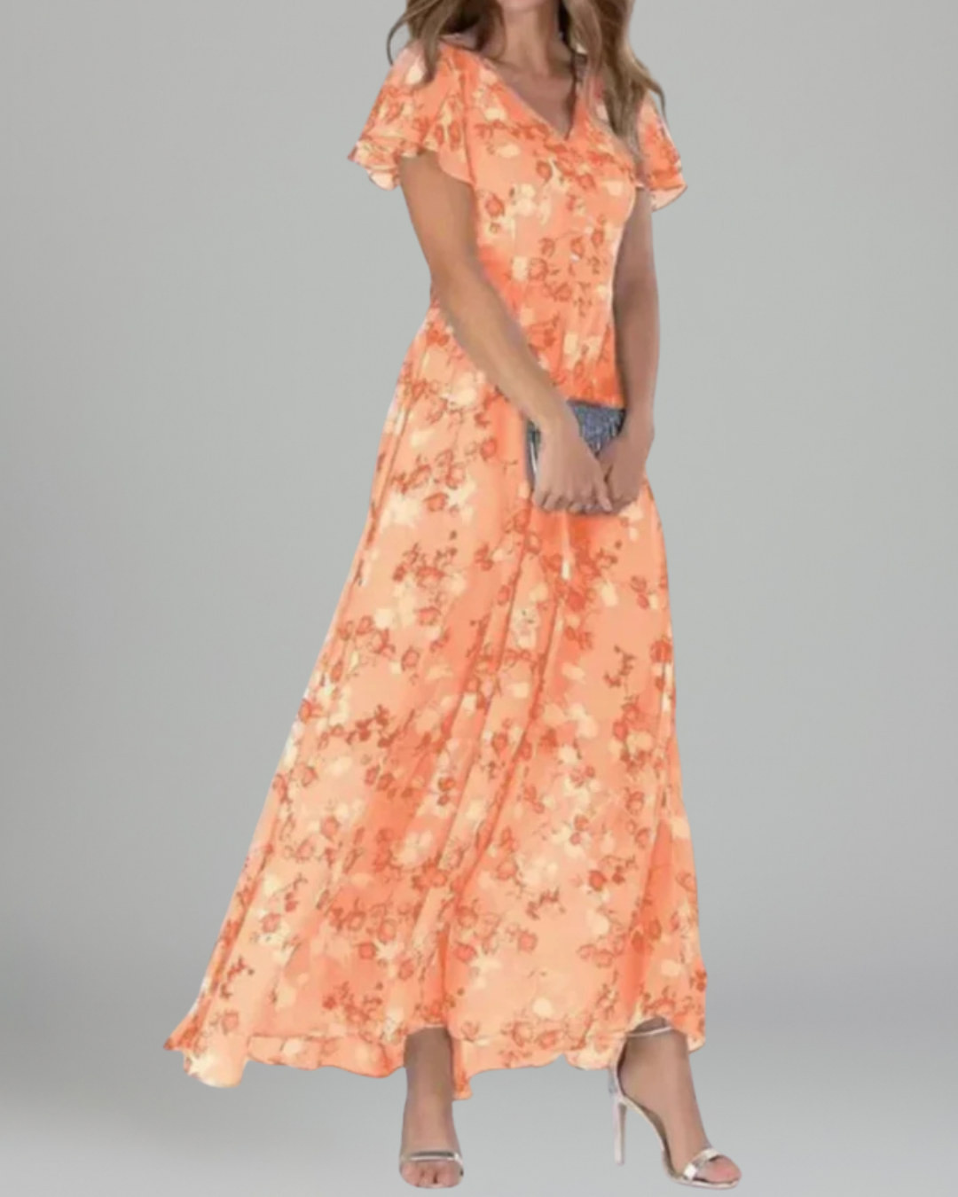 The fitted bodice and flowing skirt accentuate the silhouette, while the short sleeves and V-shaped neckline add a delicate romantic touch.