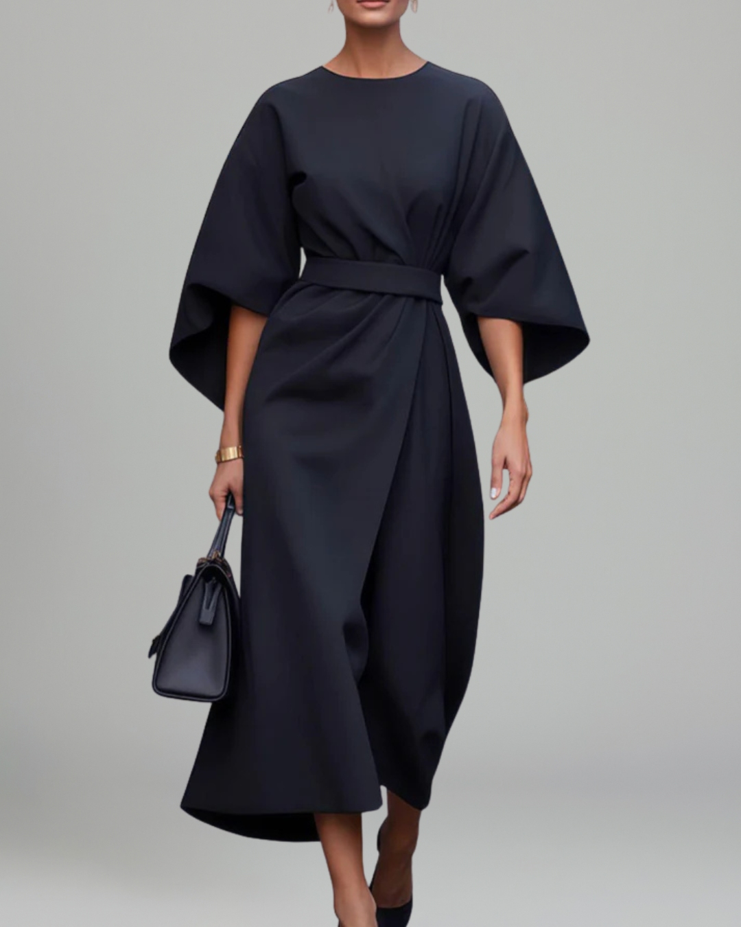 Oversized sleeves and a fitted belt add modern and refined accents.