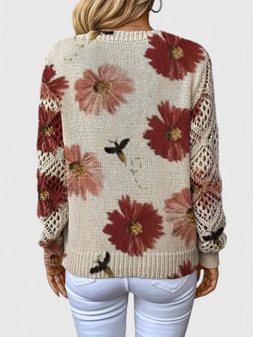 Bring warmth and charm to your everyday style with the Maribelle Bloom Sweater. Crafted with a soft knit blend, this sweater combines comfort with effortless elegance. The delicate openwork sleeves add a touch of artistry, while the floral motif evokes a romantic, feminine spirit. Pair with denim for a relaxed weekend or with tailored trousers for a chic, polished look. A timeless piece that makes every day feel a little more special.